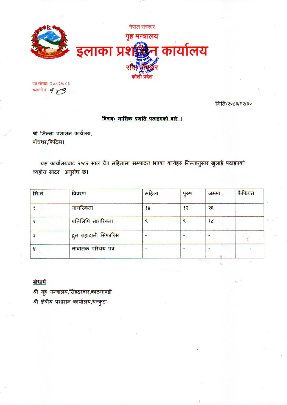 २०८२ चैत्र महिनाको मासिक प्रगति विवरण